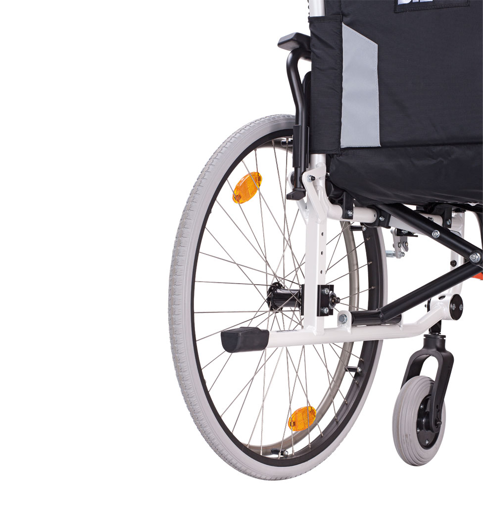 Produktdetails: korrosionsbeständiger Aluminiumrahmen | Armauflage verstellbar | Seitenteile nach hinten abschwenkbar | Beinstütze seitlich abschwenkbar/abnehmbar | Fußplatten höhenverstellbar, mit Fersenband | Antriebsrad 24 Zoll, inkl. Steckachse | Lenkrad 7 Zoll | PU-Bereifung | mit Trommelbremse.