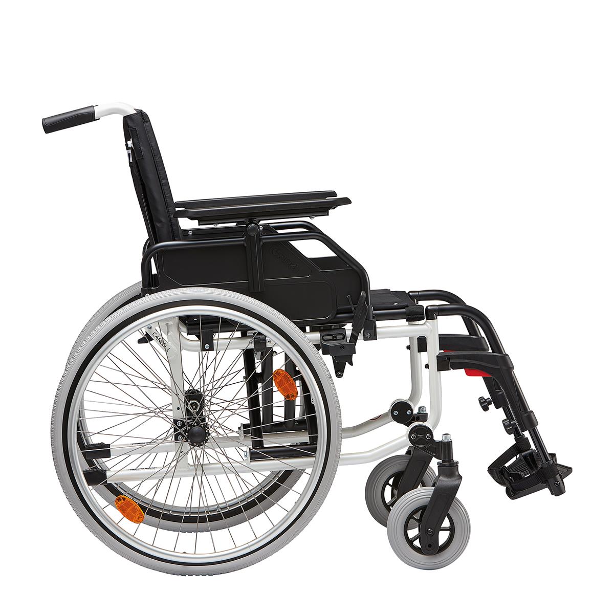 Technische Daten: Gesamthöhe 100 cm | Gesamtlänge 111 cm | Gesamtlänge ohne Beinstützen 85 cm | Faltmaß 31 cm | Sitztiefe 47 und 51 cm | Sitzhöhe 48, 51, 54 und 57 cm | Rückenhöhe 46 cm | Seitenteilhöhe 24, 26, 28 cm | Unterschenkellänge 42 bis 51 cm, in 15 mm-Schritten einstellbar | Antriebsrad 24 Zoll, Lenkrad 7 Zoll | max. Belastbarkeit 150 kg | Farbe elfenbein | VE 1 Stück.