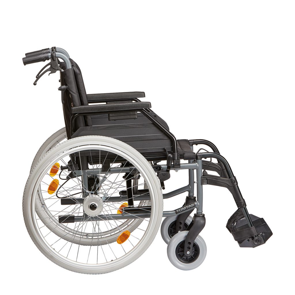 Technische Daten: Gesamtbreite = SB + 20 cm, gefaltet 31 cm | Gesamtlänge 105 bis 111 cm | Gesamthöhe 94,5 bis 103 cm | Rückenhöhe 39 bis 48 cm | Sitztiefe 40 bis 44 cm | Sitzhöhe 51 cm | Armlehnenhöhe ohne Sitzkissen 22 bis 25 cm | Armlehnenbreite 4,5 cm | Unterschenkellänge 36 bis 51 cm | Antriebsräder 24 Zoll, Lenkräder 7 Zoll | Farbe mangan grey metallic | VE 1 Stück.