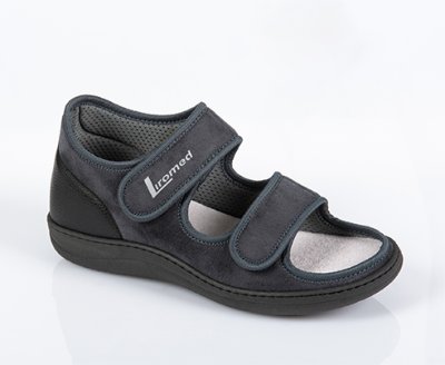 Produktdetails: 2 Klettverschlüsse | Obermaterial Mikrofaser | Zwischenkaschierung aus Moltopren | 1 cm Wechselschaumeinlage/Frotteebezug | für den langzeitigen Einsatz | weit zu öffnen| Aufnahme mit Fußverband und evt. Bettung | weiche und flexible Anpassung bei fast allen Fußformen | individuell regulierbare Verschlüsse | herausnehmbare Einlegesohle | rutschhemmende PU-Laufsohle | geeignet für den Innen- und Außenbereich.